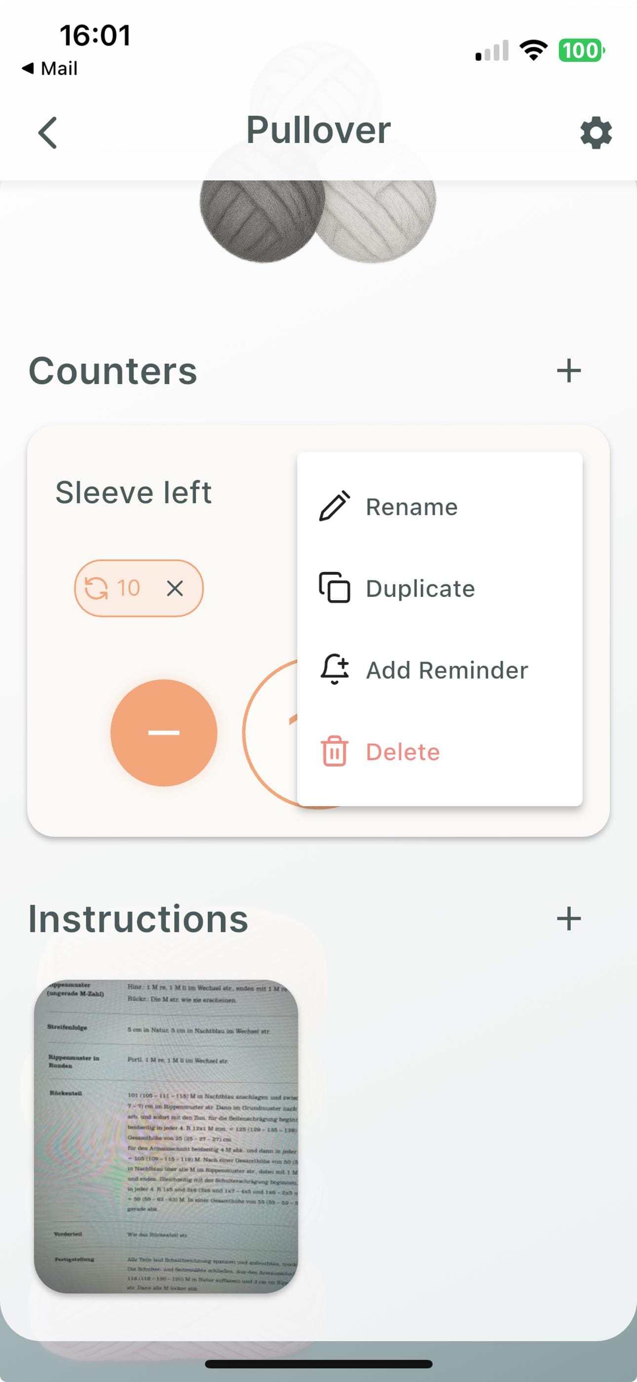 Minas Maschen helps you stay organized and focused on your knitting projects. Easily manage multiple projects, track progress with customizable counters, and never miss a stitch with smart reminders—whether one-time or repeating. Upload and view your instructions directly in the app for easy access anytime.